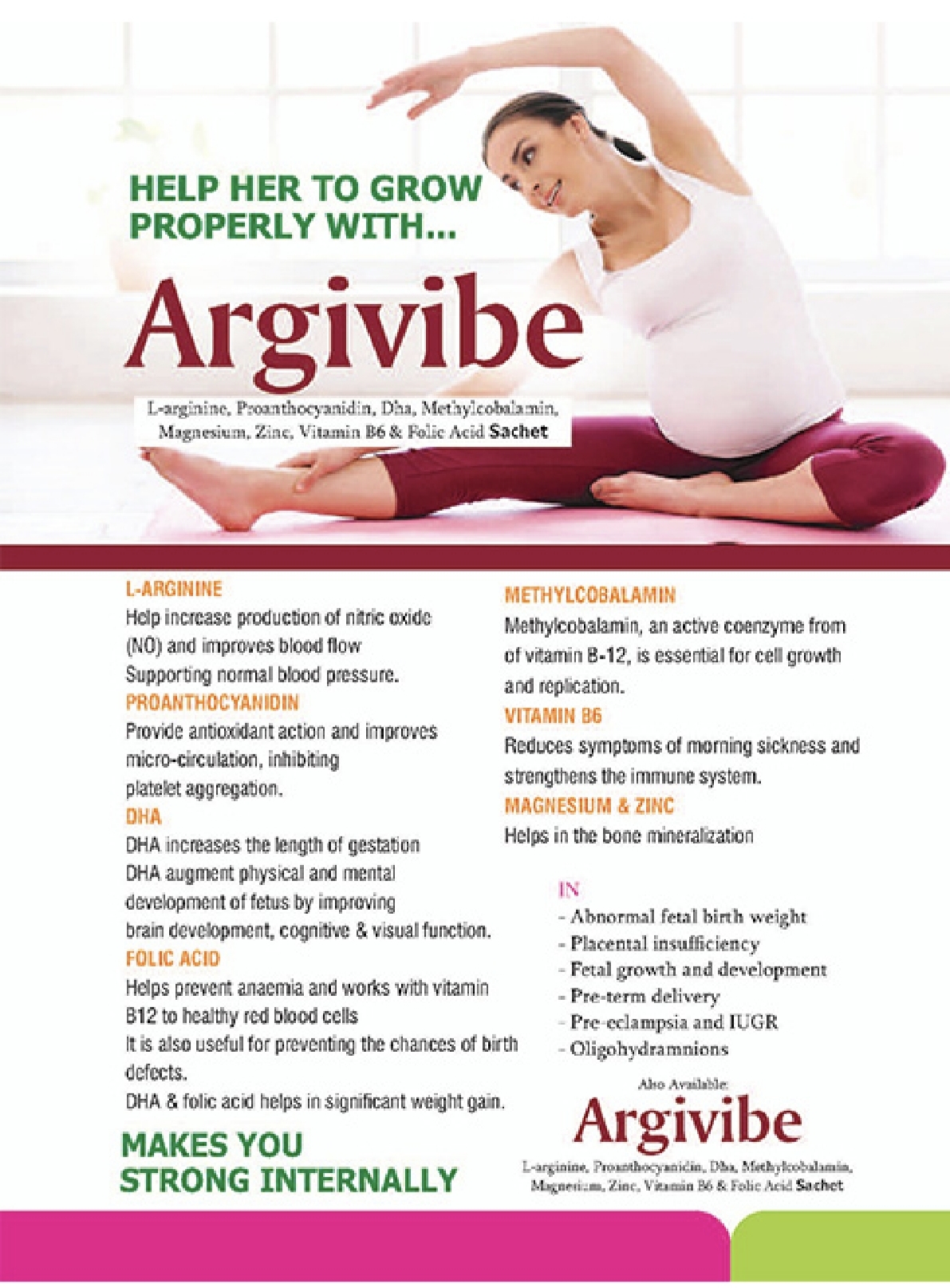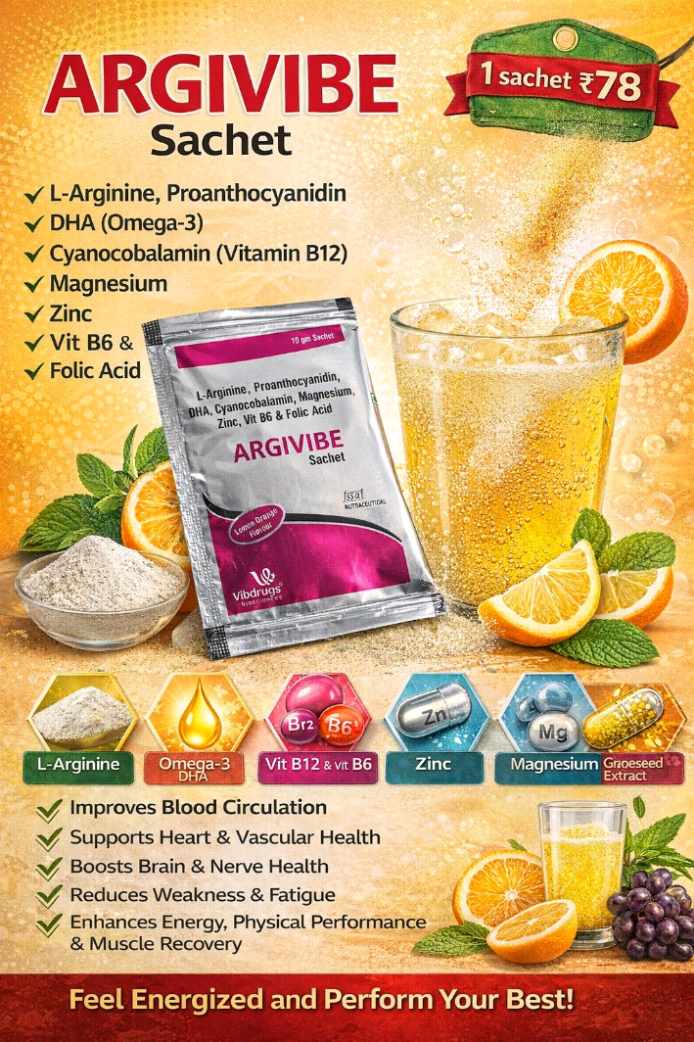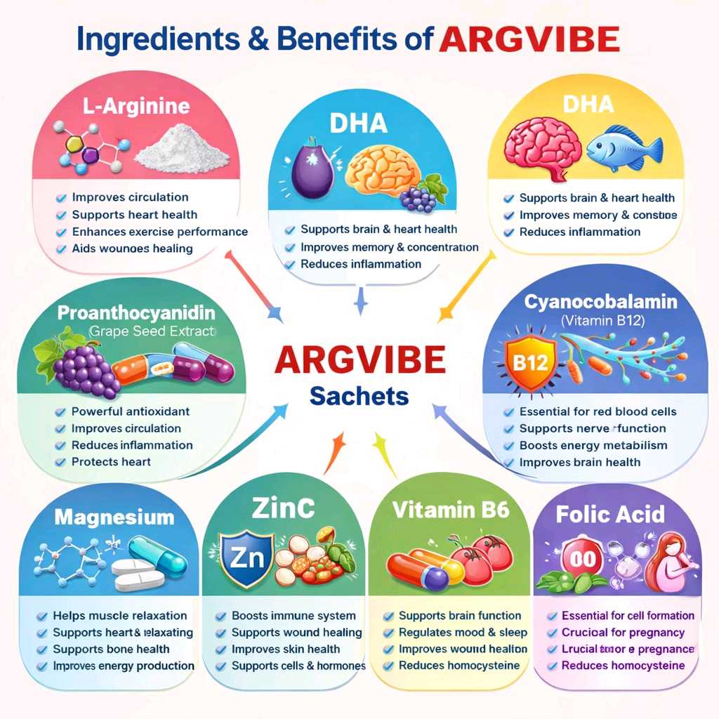 Benefits: •Essential for DNA and cell formation. •Supports red blood cell production. •Important during pregnancy for fetal development. •Helps reduce homocysteine levels (heart protection). •Supports brain and nerve health. Overall Purpose of ARGVIBE Sachets: This combination generally helps in... Improving blood circulation Supporting heart and vascular health Enhancing nerve function Boosting energy metabolism Supporting brain and reproductive health